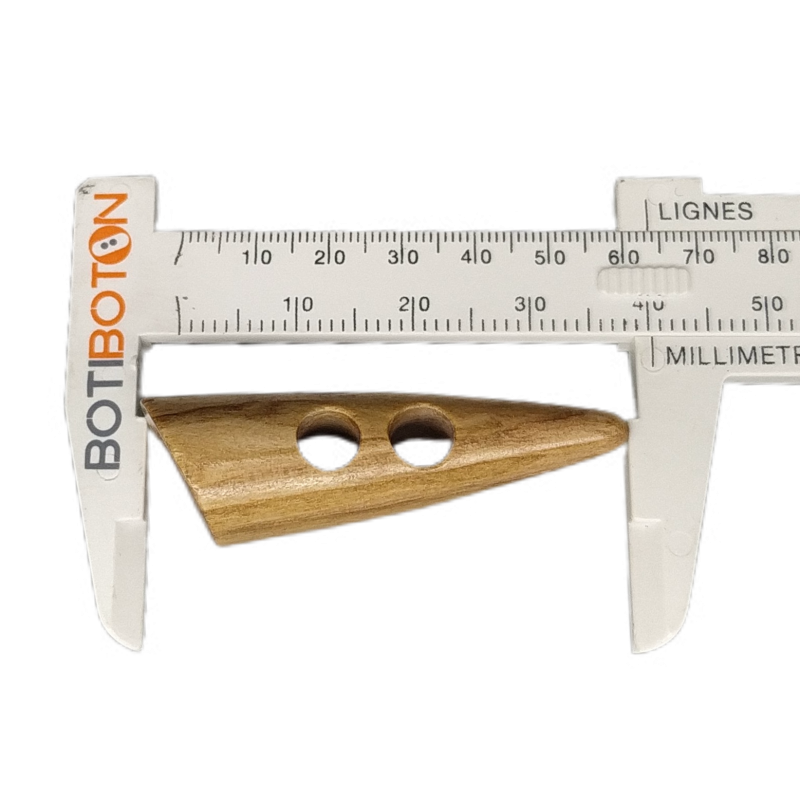 Die hölzernen Dufflecoat-Knöpfe TMD 1506 sind aus natürlichem Olivenholz gefertigt, haben einen hellbraunen Farbton und zwei Löcher zum Annähen an das Kleidungsstück.