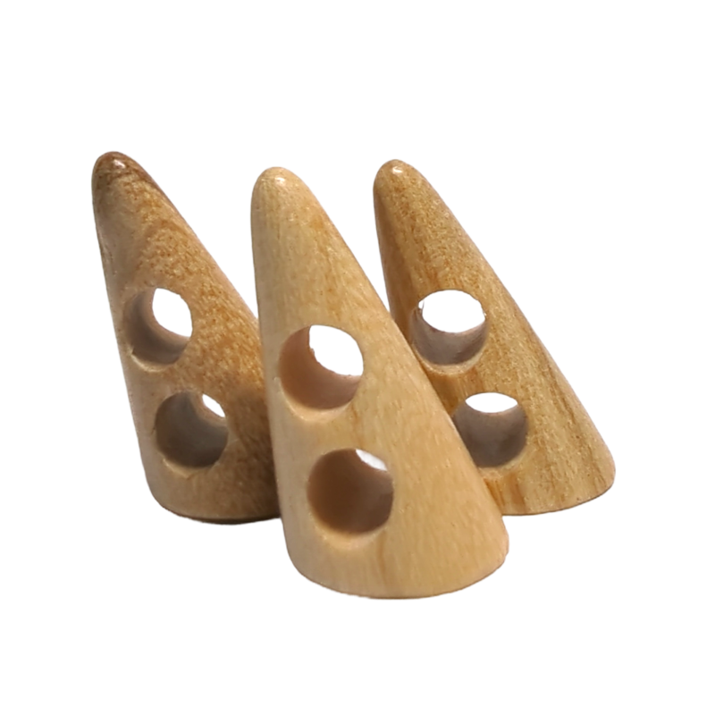 Die hölzernen Dufflecoat-Knöpfe TMD 1506 sind aus natürlichem Olivenholz gefertigt, haben einen hellbraunen Farbton und zwei Löcher zum Annähen an das Kleidungsstück.