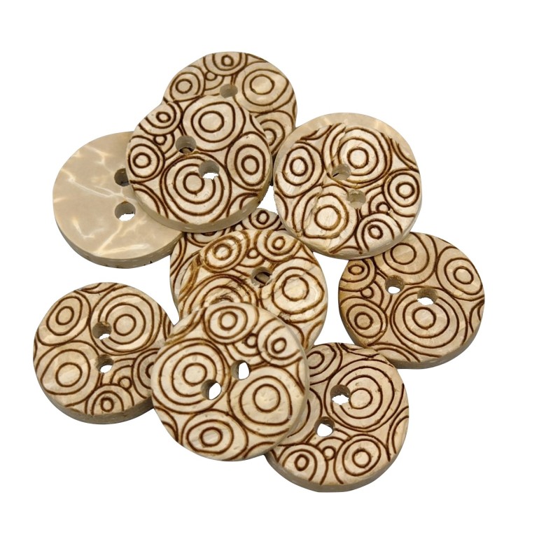 Die weißen Kokosnussknöpfe mit Kreisen werden aus Kokosnussschalen hergestellt, wodurch sie ein sehr natürliches Aussehen wie Baumrinde erhalten.