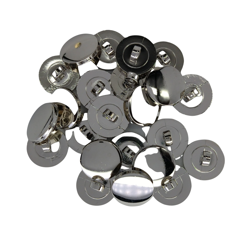 Classic flat, shiny button, made of nylon and finished with silver chrome plating.