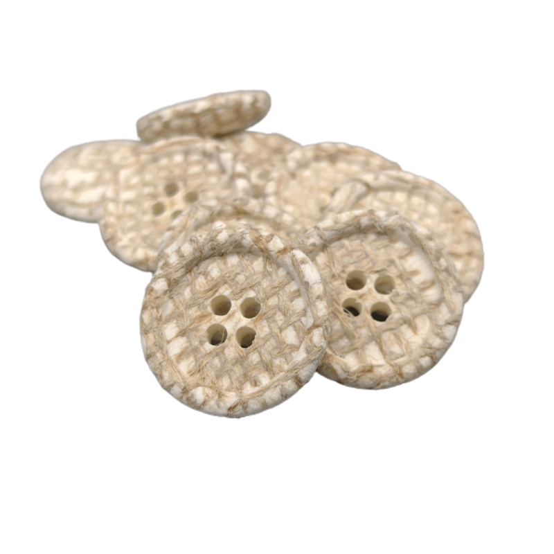 The JUTE buttons are made with jute fibers, wood, and binders.