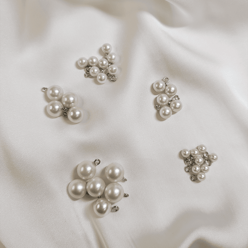 - Imitation pearl buttons with a ball shape and a metal ring for sewing. (They won't rust)
