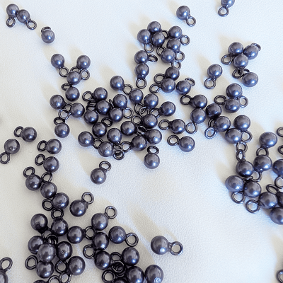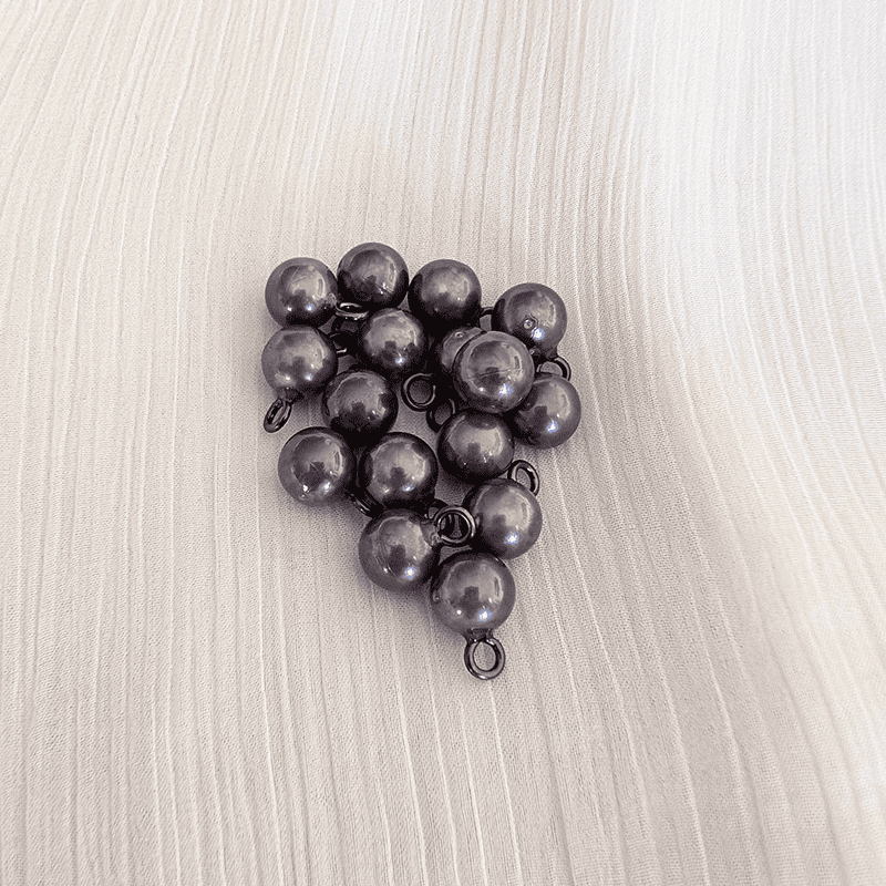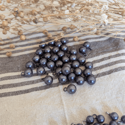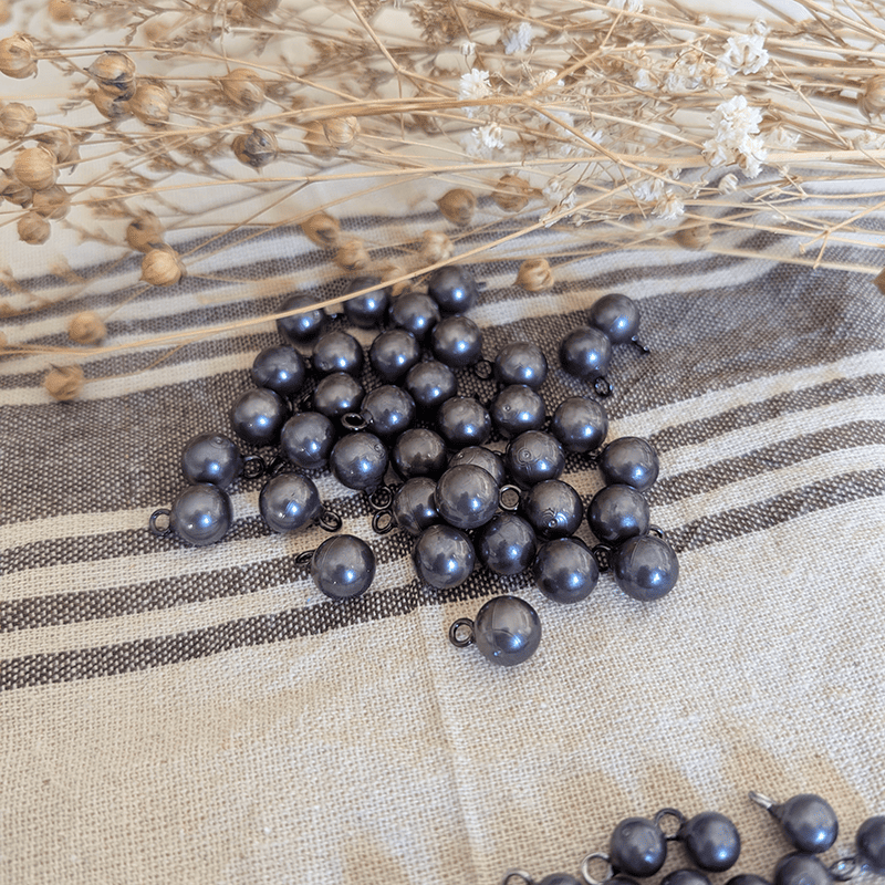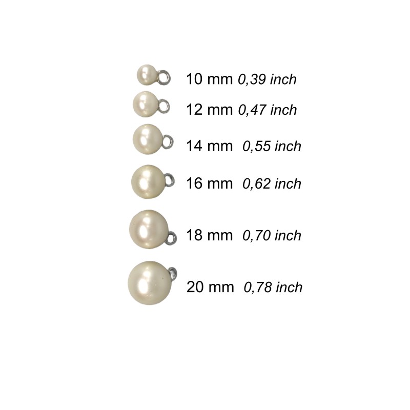 - Imitation pearl buttons with a ball shape and a metal ring for sewing. (They won't rust)