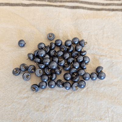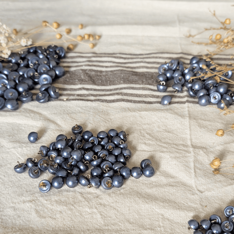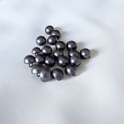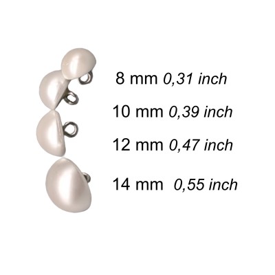 Imitation pearl buttons in the shape of a half ball with a metal ring for sewing. (They won't rust)