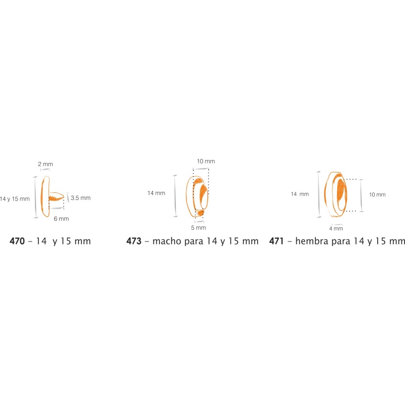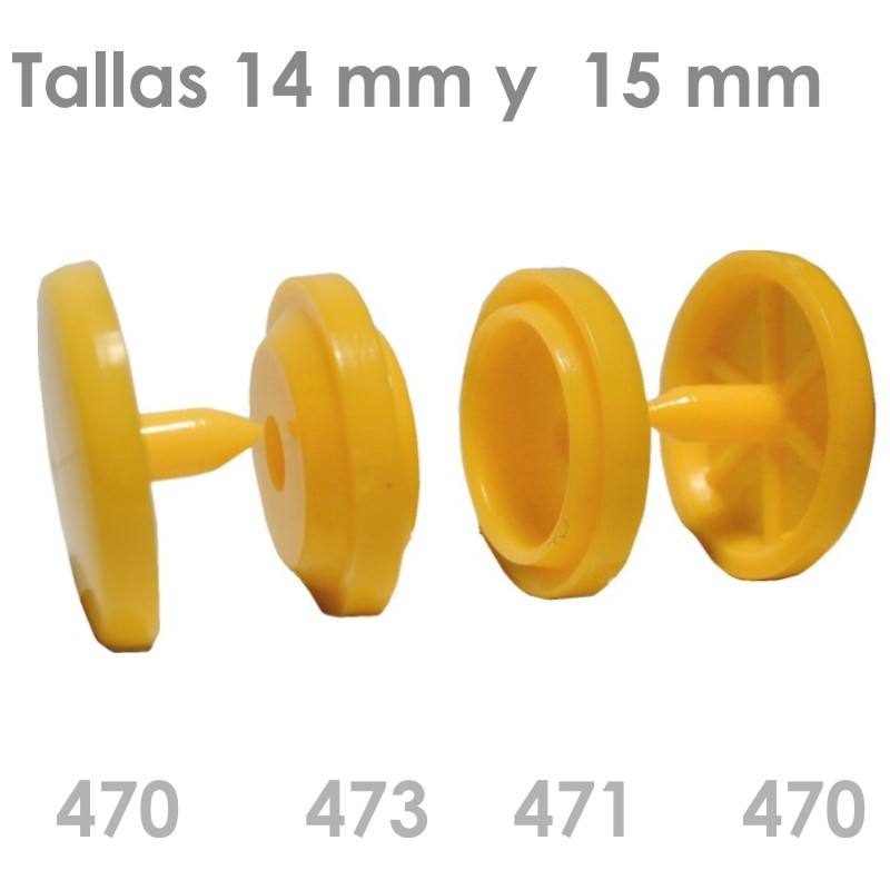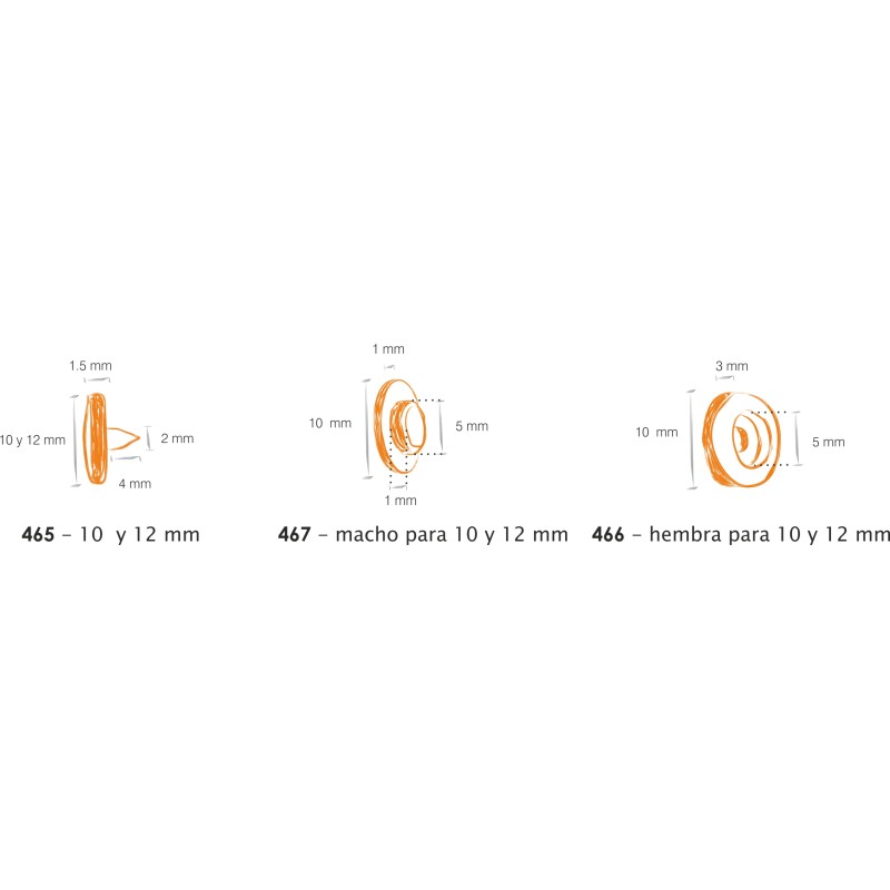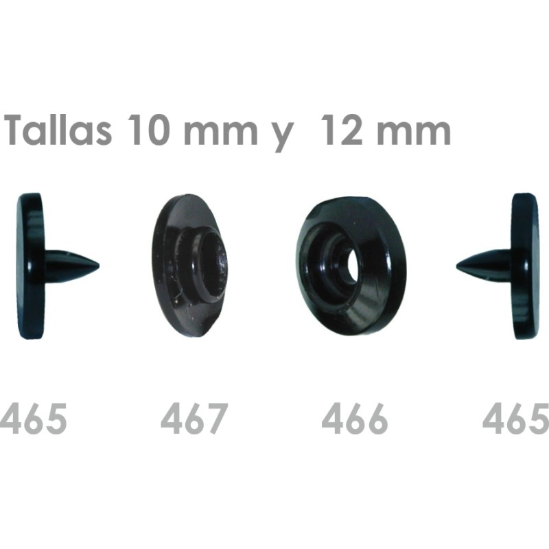 4 pieces - 2 Calotes - 1 Male - 1 Female 4 sizes available 10 and 12 mm 14 and 15 mm ACETALLIC RESIN, a synthetic resin that guarantees good elasticity and mechanical resistance over a wide temperature range, from – 40º to +130º C. The material is non-toxic, making it suitable for food and baby items. Machine washable up to 85º and dry cleaning. To the chemical attacks of acids Applicable to a multitude of fields, including clothing, leather goods, carpet making, toys, and advertising promotion, among others. Applicable to all types of materials as long as they are tensile-resistant. Cardboard, polypropylene, fabric, skai, leather, polyamide, etc. Ideal for reversible garments, since the caps are the same on both sides With manual machine. With pneumatic machine. With semi-automatic machine. With automatic machine. Opening Closing 10 and 12 mm 8– 10 N 10 – 15 N 14 and 15 mm 12 to 20 N 15 to 25 N The calotes allow personalization with the customer's name. |