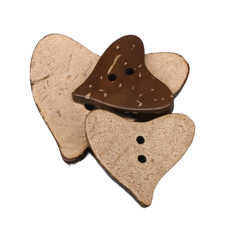Les boutons en forme de cœur sont fabriqués à partir de coques de noix de coco.