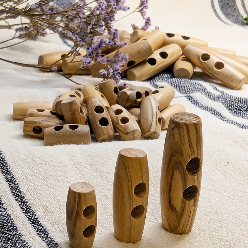 Les boutons en bois du duffle-coat TMD 1502 sont fabriqués en bois d'olivier naturel, de couleur brun clair, et comportent deux trous pour être cousus sur le vêtement.