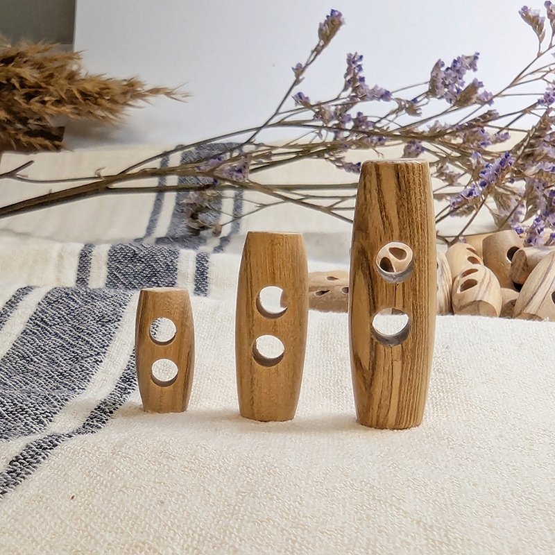 Les boutons en bois du duffle-coat TMD 1502 sont fabriqués en bois d'olivier naturel, de couleur brun clair, et comportent deux trous pour être cousus sur le vêtement.