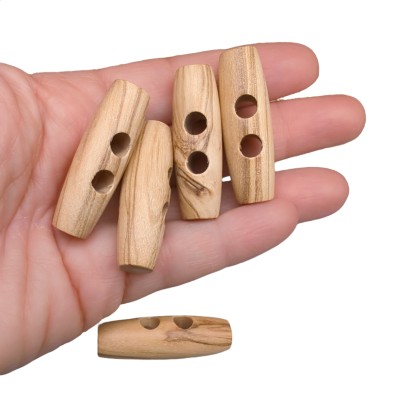 Les boutons en bois du duffle-coat TMD 1502 sont fabriqués en bois d'olivier naturel, de couleur brun clair, et comportent deux trous pour être cousus sur le vêtement.