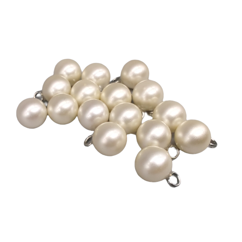 • Boutons en imitation nacre, de forme sphérique, avec un anneau métallique pour la couture. (Ils ne rouillent pas.)
