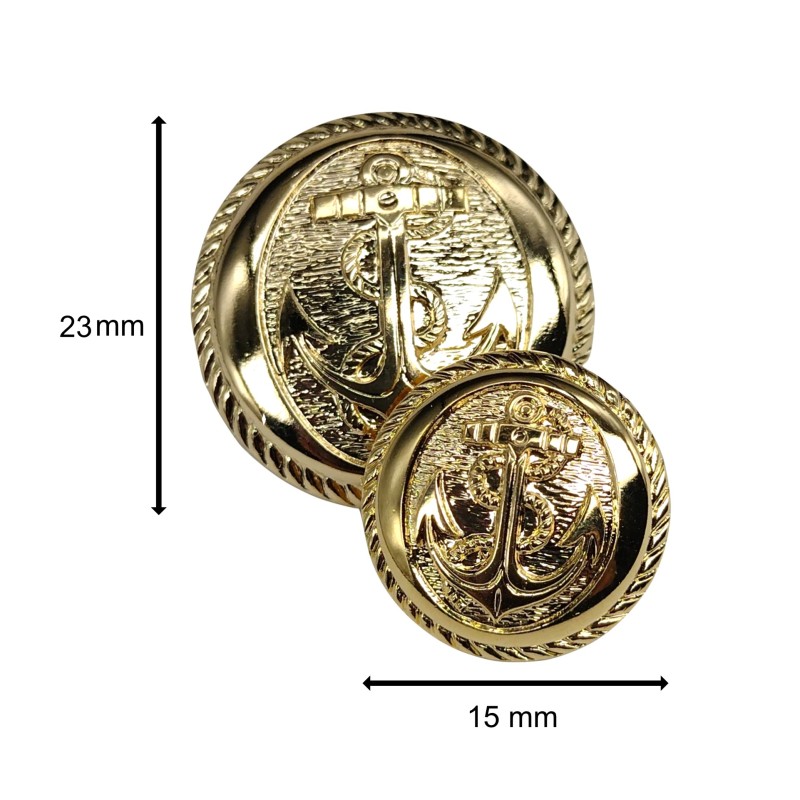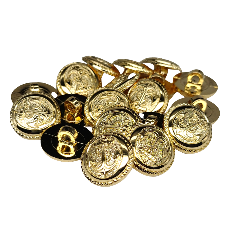 Classico bottone da marinaio con incisione di un'ancora, realizzato in nylon e rifinito con cromatura dorata.