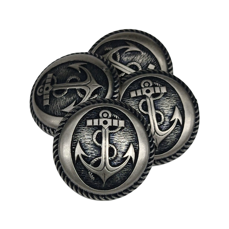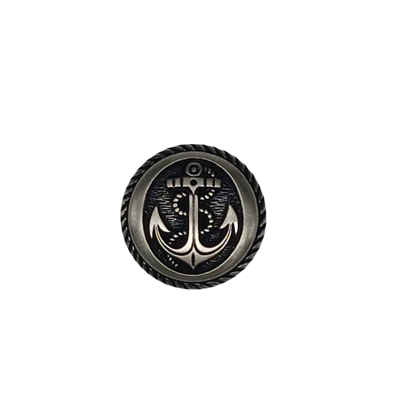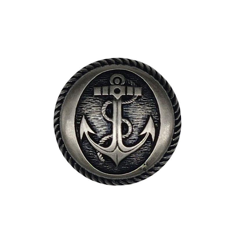 Classico bottone da marinaio con incisione di un'ancora, realizzato in nylon e rifinito con cromatura color argento anticato.