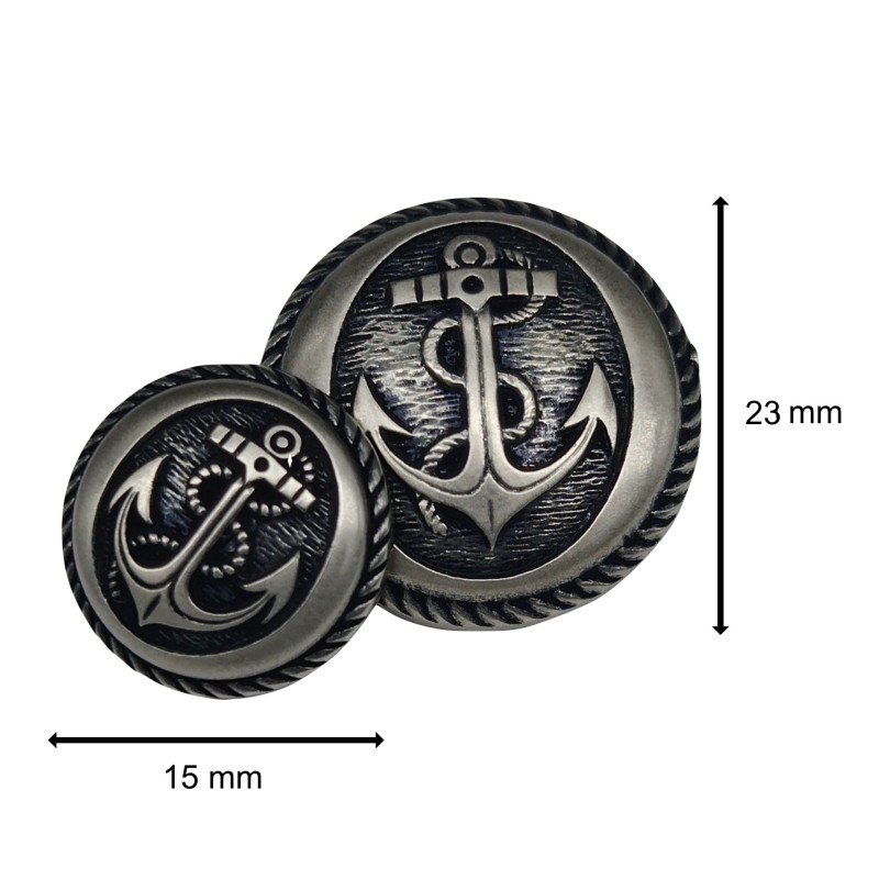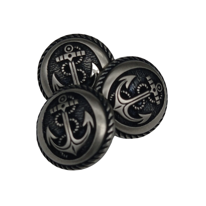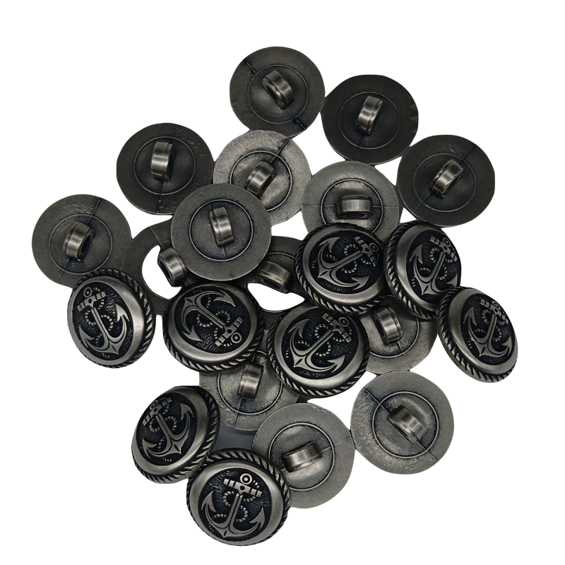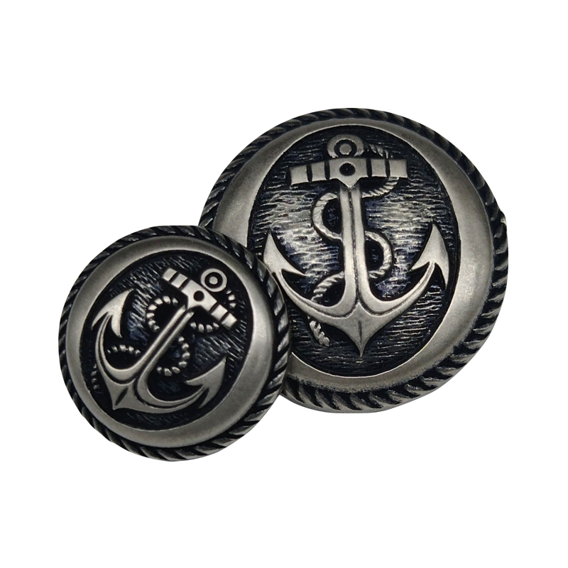Classico bottone da marinaio con incisione di un'ancora, realizzato in nylon e rifinito con cromatura color argento anticato.