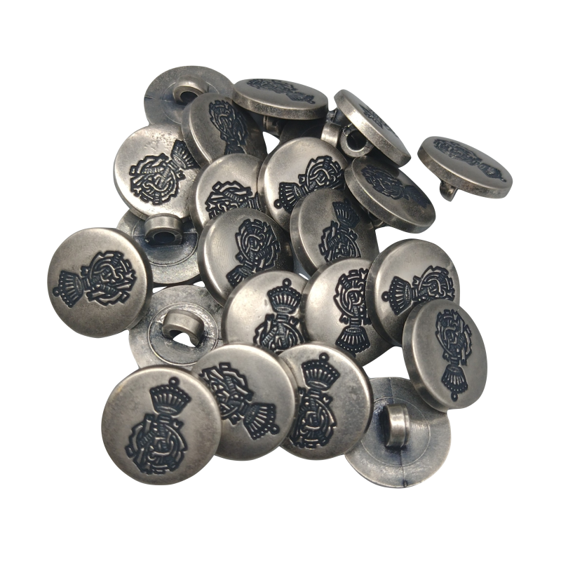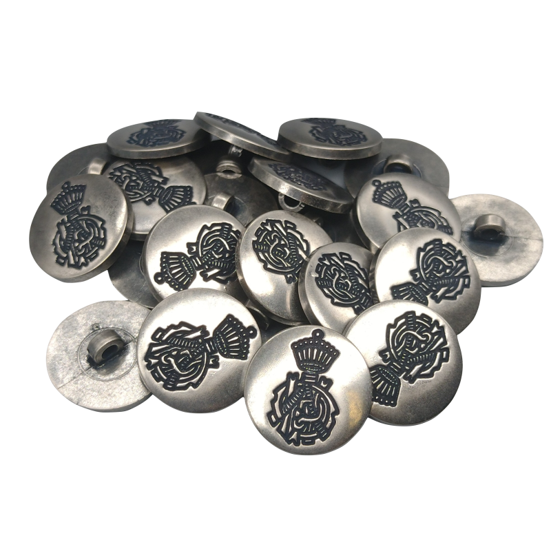 Bottone classico con scudo inciso, realizzato in nylon e rifinito in argento anticato.